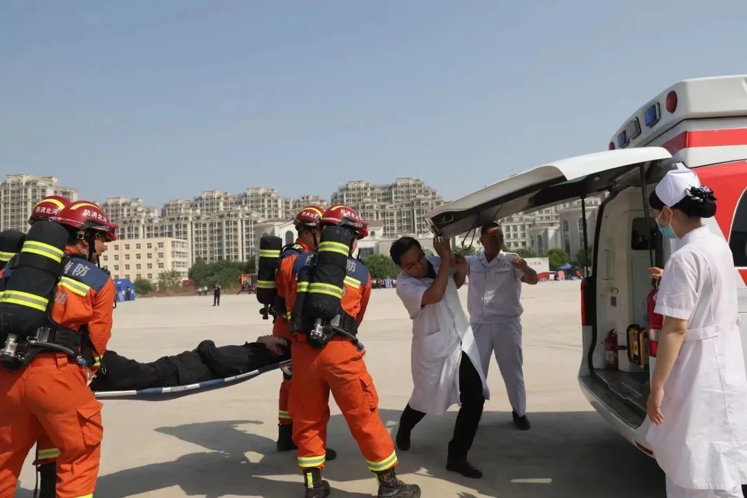 現場模擬5月10日9時20分00秒,燕郊地區發生5.1級地震場景,燕郊高新區第一時間接到速報信息后立即成立抗震救災指揮部,進行疏散安置、搜索救援、醫救防疫、建筑物坍塌救援、危化品泄漏處置、火場救援、基礎設施搶險等工作。演練現場設置了啟動應急響應、應急處置與救援、應急響應結束、總結點評等環節。
